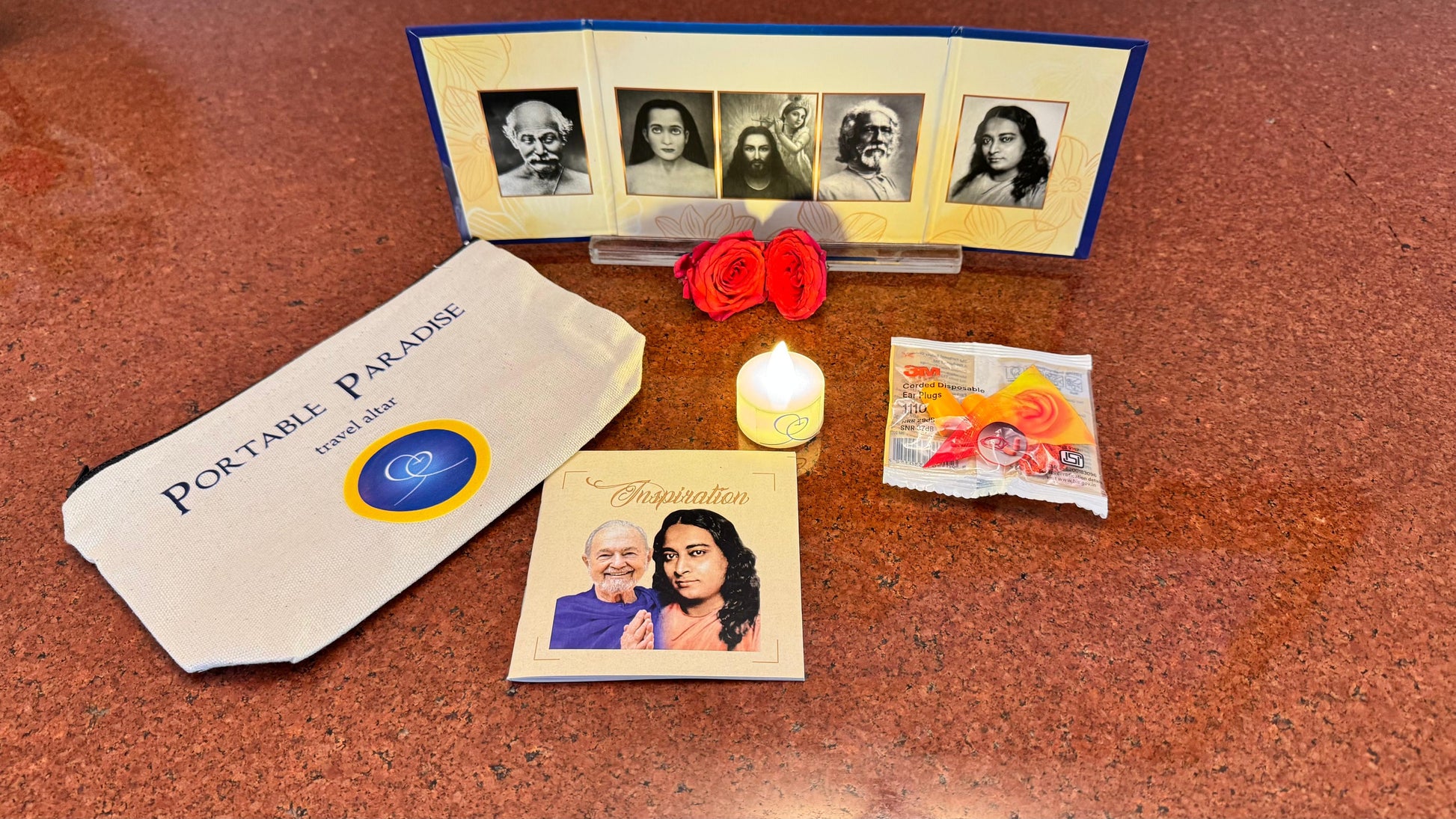 This portable travel altar on poster board can be taken with you everywhere you go. Carry with you the images and blessings of these great spiritual masters: Jesus Christ, Mahavatar Babaji, Lahiri Mahasaya, Swami Sri Yukteswar, and Paramhansa Yogananda. Convenient and easy to open and set up, this travel altar can temporarily convert any space into a meditation room.